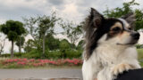 広大で寝そべりたくなるような芝生広場、モコも気持ちよさそうでした。